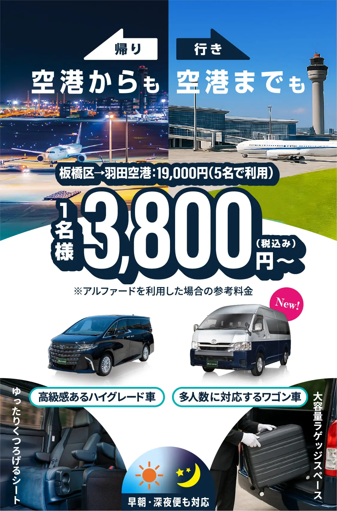 板橋区→羽田空港:19,000円(5名で利用)1名様 3,800円(税込み)